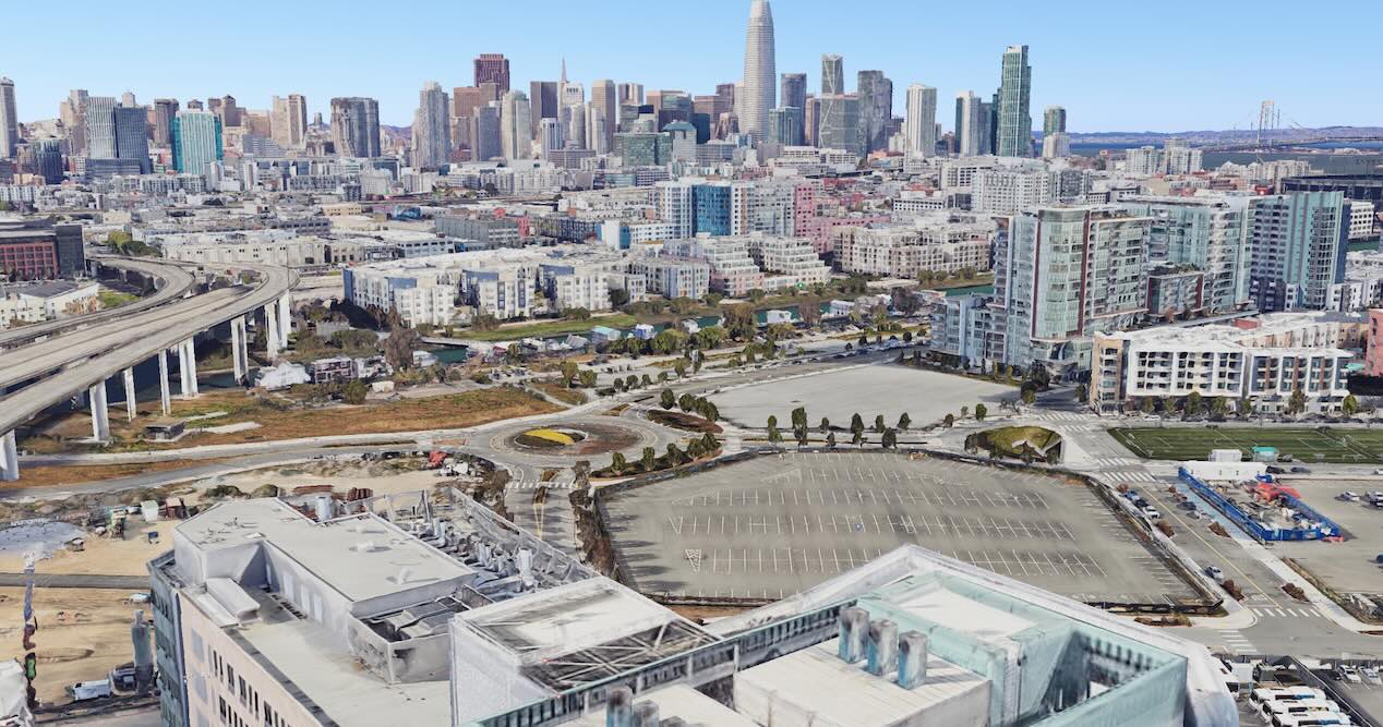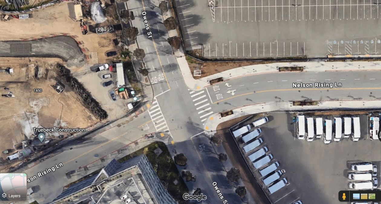 Owens Street meets Nelson Rising Lanes in Mission Bay, San Francisco. The parcel northeast of the intersection (currently occupied by a parking lot) is the future site of the proposed SFUSD Mission Bay Elementary School.