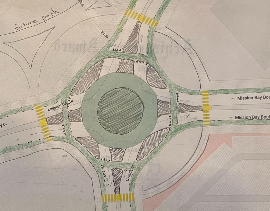A hand-drawn sketch by Nik Kaestner to illustrate core concepts of a proposed project to add separated cycling facilities to an existing traffic circle at the intersection of Mission Bay Drive and Owens St.